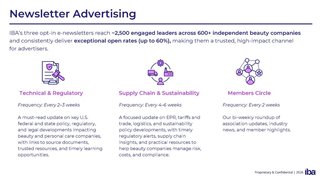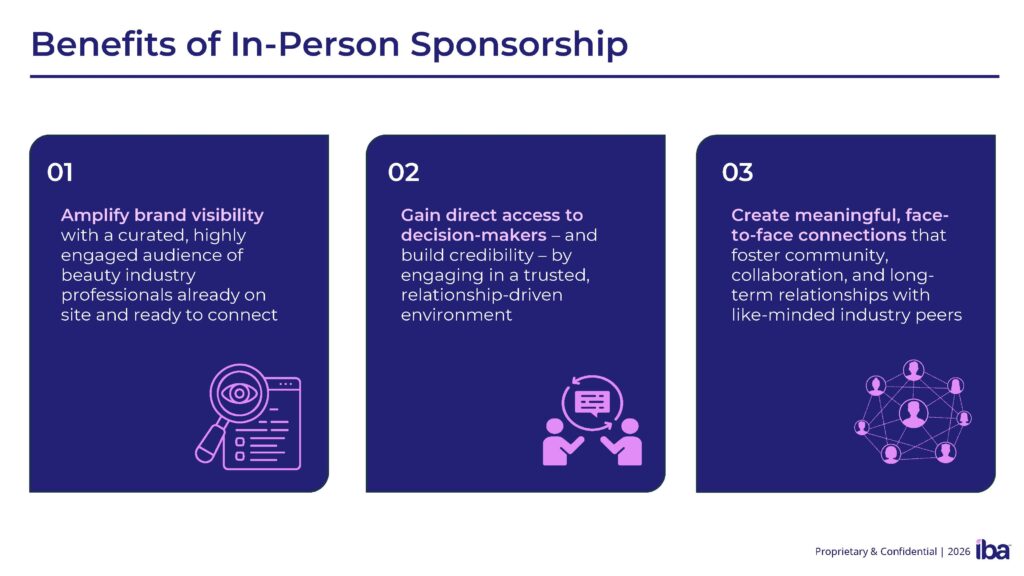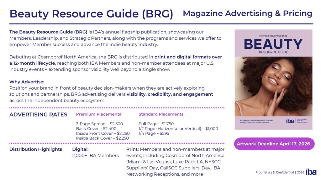 We offer many educational and networking events throughout the year. Let our attendees know your company supports IBA’s mission to provide high-quality education and networking events that are affordable and accessible to businesses of all sizes. Check out our calendar for our upcoming virtual and in-person events. Contact Liz Gill, lgill@independentbeauty.org, to get started.